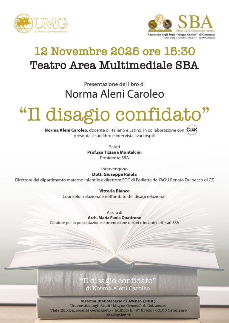 Presentazione libro “Il disagio confidato” di Norma Aleni CaroleoDi adminSBAunicz / 4 Novembre 2025 Visitatori: 16