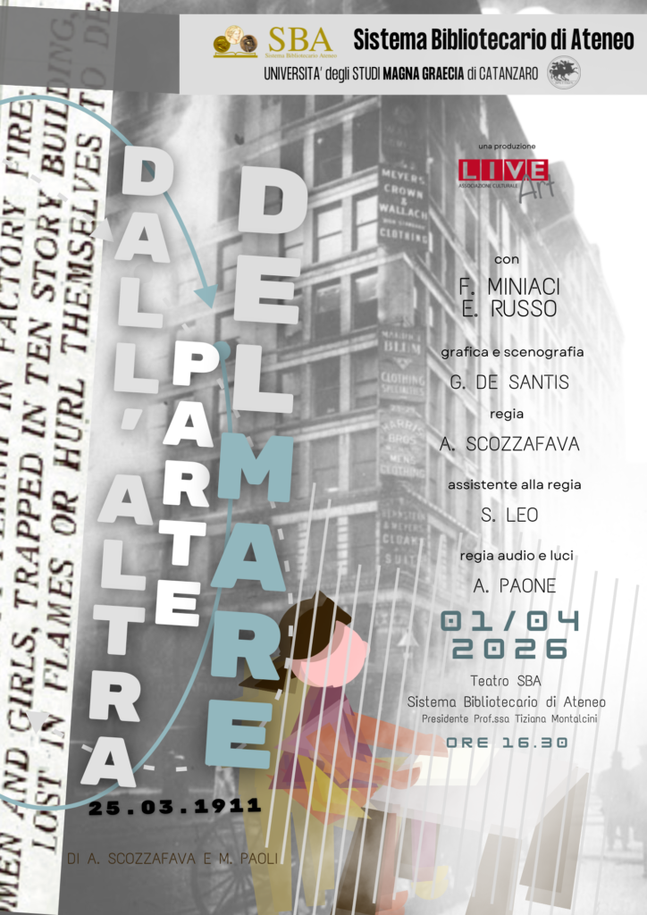 Dall’altra parte del mare è una piéce teatrale poetica e intensa che racconta il sogno, la fatica e la dignità dell’emigrazione. Attraverso la voce di Francesca, giovane italiana partita per l’America i primi del ‘900, e quella del Maestro del suo paese che legge la sua lettera alla famiglia, si intrecciano nostalgia, speranza e memoria.